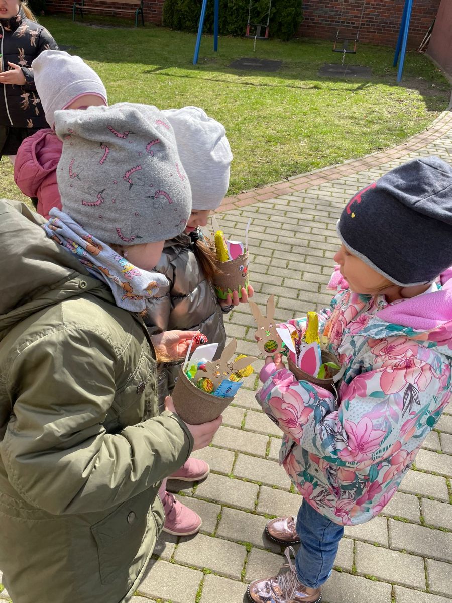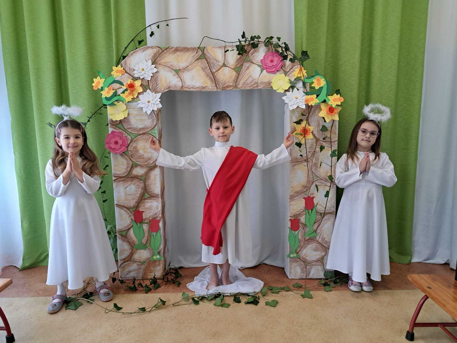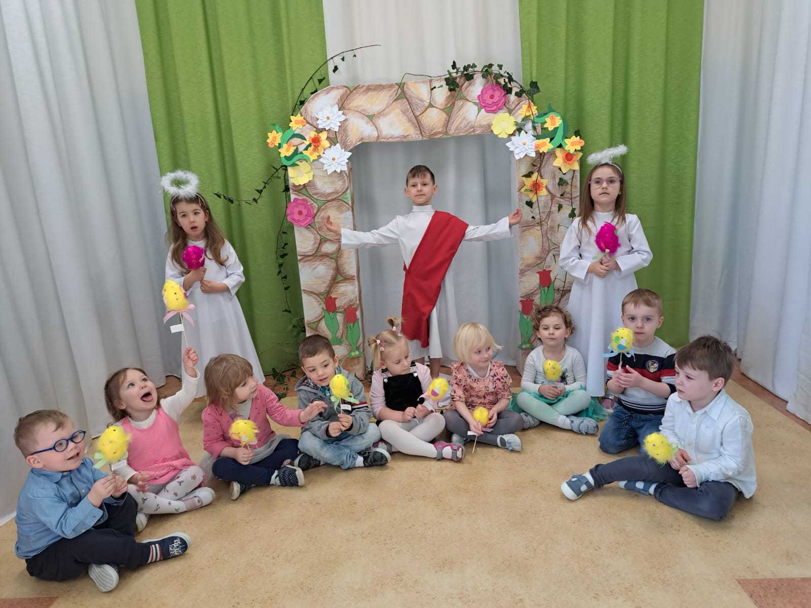 Inscenizacja zmartwychwstania przez dzieci, piosenki, wierszyki, szukanie zajączka w ogrodzie, wyjście z życzeniami do proboszcza